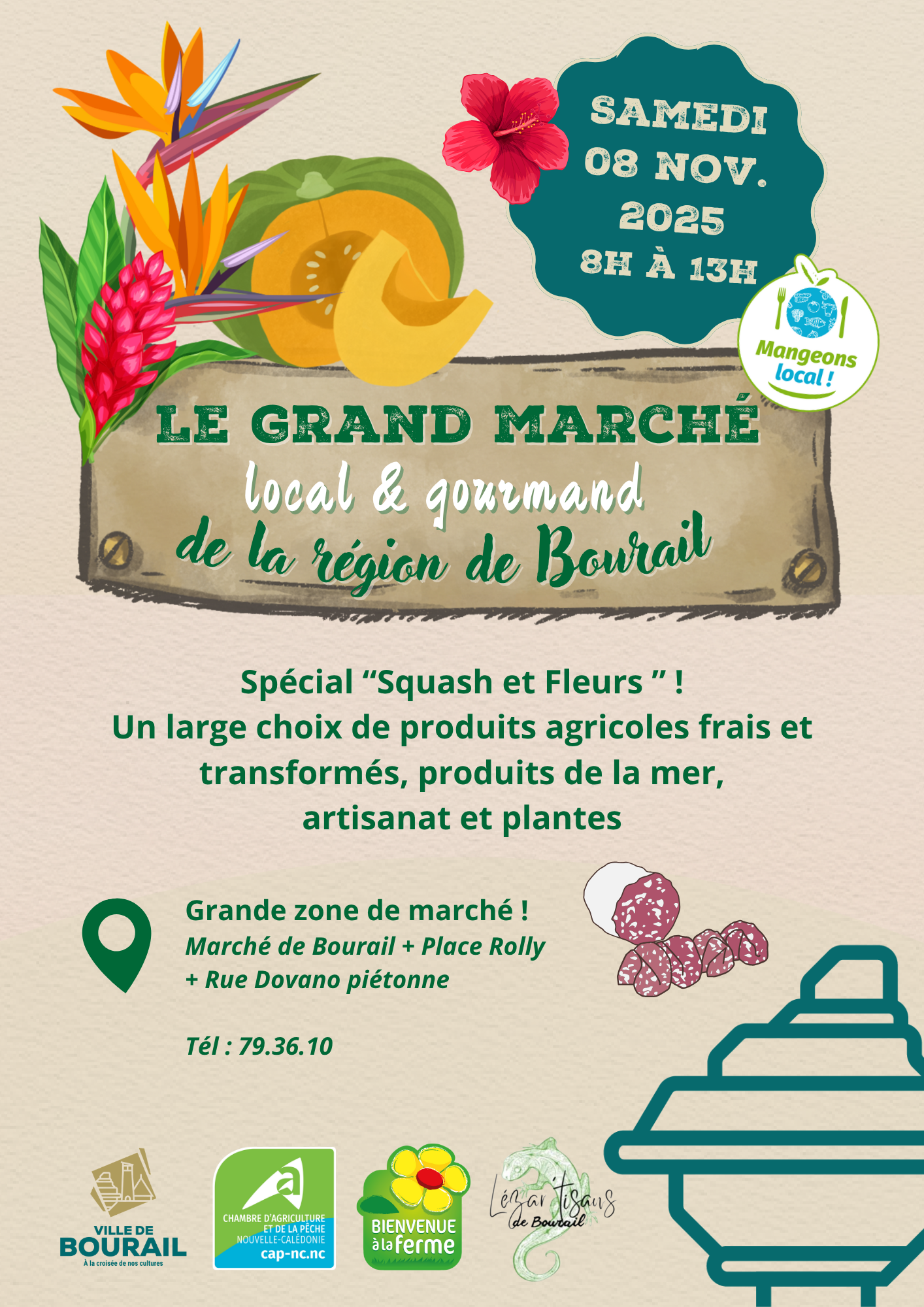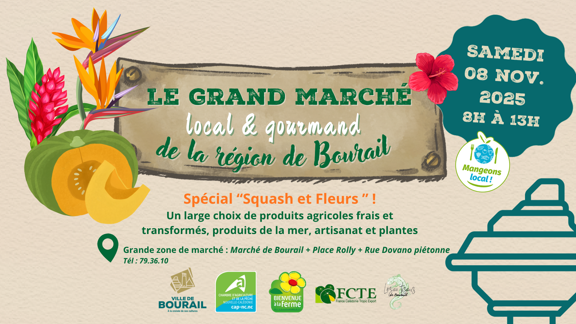 La Chambre d’agriculture et de la pêche de Nouvelle-Calédonie, en partenariat avec la Ville de Bourail, la FCTE, l’association Lézar’tisans de Bourail et le Marché communal, a le plaisir de vous annoncer la tenue du 𝐆𝐫𝐚𝐧𝐝 𝐌𝐚𝐫𝐜𝐡𝐞́ 𝐋𝐨𝐜𝐚𝐥 & 𝐆𝐨𝐮𝐫𝐦𝐚𝐧𝐝 – 𝐒𝐩𝐞́𝐜𝐢𝐚𝐥 𝐒𝐪𝐮𝐚𝐬𝐡 & 𝐅𝐥𝐞𝐮𝐫𝐬, 𝐪𝐮𝐢 𝐬𝐞 𝐝𝐞́𝐫𝐨𝐮𝐥𝐞𝐫𝐚 𝐥𝐞 𝐬𝐚𝐦𝐞𝐝𝐢 𝟖 𝐧𝐨𝐯𝐞𝐦𝐛𝐫𝐞 𝟐𝟎𝟐𝟓 𝐝𝐞 𝟖𝐡 𝐚̀ 𝟏𝟑𝐡 𝐬𝐮𝐫 𝐥𝐚 𝐏𝐥𝐚𝐜𝐞 𝐑𝐨𝐥𝐥𝐲, rue Dovano et au Marché communal de Bourail ! 🌺💥📣
